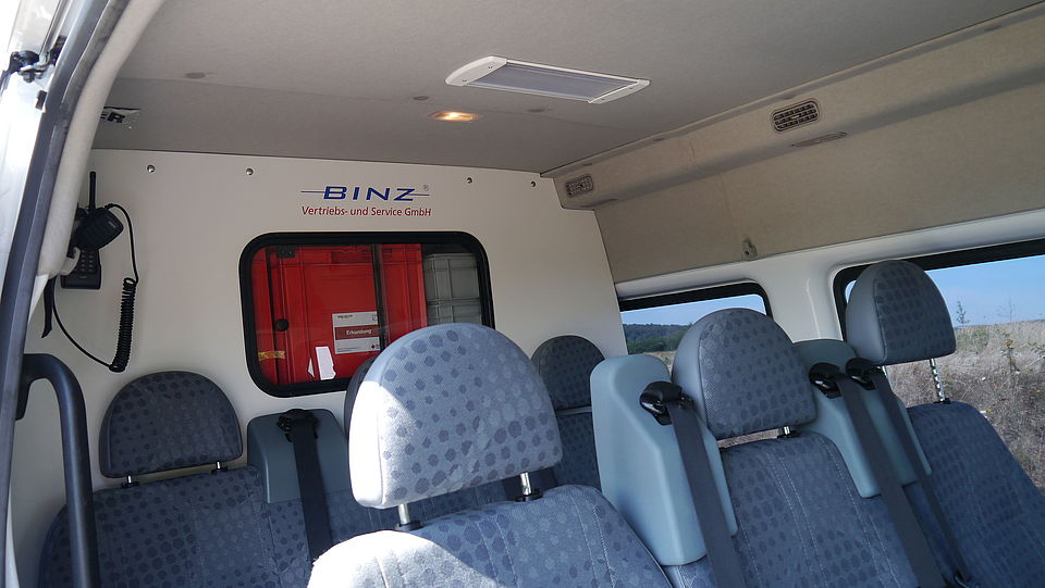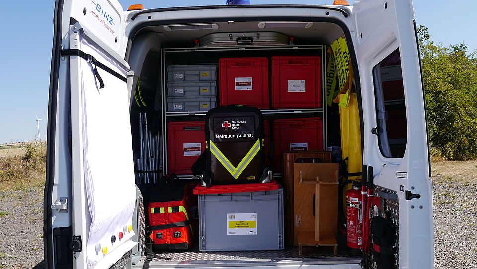 Unser MTF ist für die SEG-B im Einsatz. Für diesen Zweck ist im hinteren Teil des Fahrzeugs ein Regalsystem und Halterungen verbaut, in dem Euro-Boxen und einzelne Gegenstände für den nötigsten "Erstangriff" der SEG-B zu finden sind. Dort befinden sich unter anderem Utensilien zur Registrierung, Organisation, Absperrung, Kleinverpflegung und Beschilderungssätze. Auch ein Tisch, Stühle sowie diverse weitere Utensilien sind im platzsparenden System untergebracht.