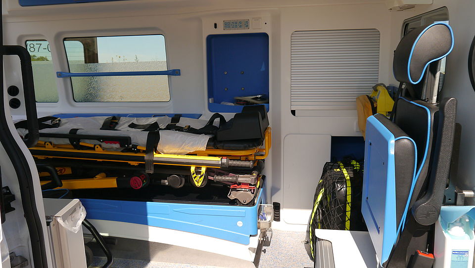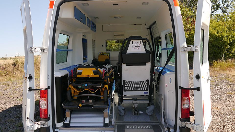 Unser KTW ist in der Ausstattung an die Krankentransportwägen des Rettungsdienstes angepasst. Im Zuge dessen findet sich neben der Ausrüstung für lebensbedrohliche Notfälle auch beispielsweise Verbandmaterial, Infusionen und Schienen. Darüber hinaus enthält unser KTW Material, das bei Sanitätsdiensten gehäuft verwendet wird (z.B. Kältesofortkompressen) und enthält Produkte für Kindernotfälle. Auch ein automatisierter externer Defibrillator (AED) der Firma Schiller mit integriertem Display findet sich in unserem KTW. Im Fahrzeug ist außerdem eine Fahrtrage der Firma Stryker und ein Tragestuhl zu finden. Für den Einsatz außerhalb des Fahrzeugs dient eine Sauerstofftasche und ein Notfallrucksack der Firma PAX-Bags.